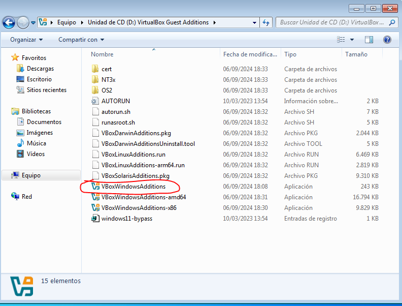 Para instalar las guest additions en windows 7 hemos cogido y nos hemos metido en dispositivos y abajo del todo pone insertar imagen de cd le damos. Nos tiene que salir en este equipo dos unidades el disco local y la unidad de CD guest additions le damos doble clic y ejecutamos el que les pongo en la siguiente foto. una vez pinchadi ese hay que seguir los pasos que nos van poniendo hasta que se termina de instalar. Una vez que acabe la instalación nos dira que la reiniciemos y una vez hecho eso ya lo tenemos instalado.